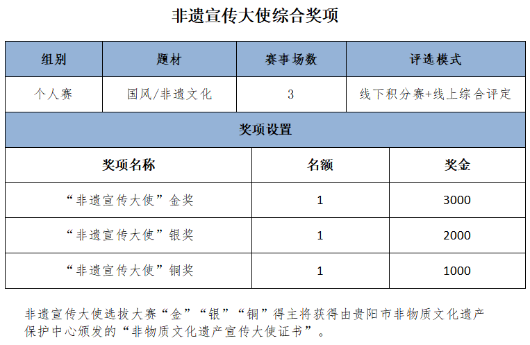 本次大赛将以国风为赛事主题,以贵阳市非物质文化遗产保护中心所搭建的平台,进行为期三场的国风现场赛事,最终根据选手的各方面综合素质选拔出“金”“银”“铜”及五个单项奖等共十一位奖项得主。