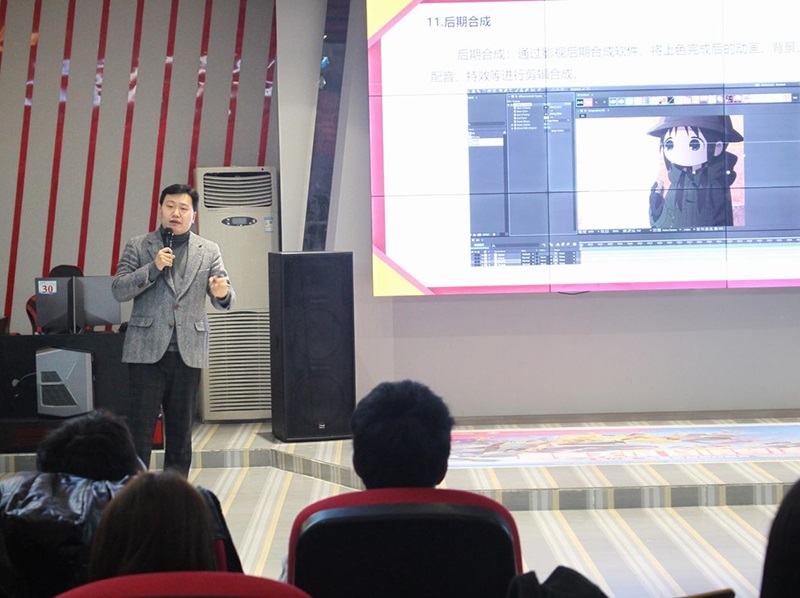 随后,倪社长邀请徐会长为同学们进行交流分享,徐会长首先对AS动漫社倪社长的工作表示赞赏与肯定,并对学校领导的支持表示感谢。活动中,徐会长向各位同学讲解了二维逐帧动画制作流程,从前期的动画企划、人物角色设计、分镜脚本绘制;到中期的动画原画、动画中割、动画仕上;乃至动画配音、后期摄影完成动画成片的全过程,并耐心的为同学们提出的疑问做出解答。会场不时响起阵阵掌声。